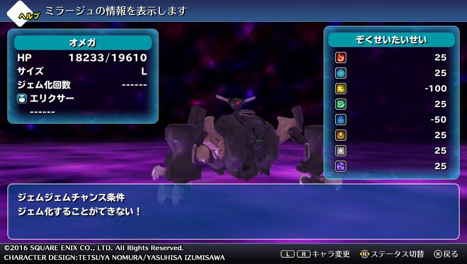 2016年11月09日 <PSV>ワールドオブファイナルファンタジー WOFF プレイ日記 「五大魔震・コーネリア編2 VS.オメガ」 スポンサーリンク 「五大魔震・コーネリア編1」をクリアすると解放されますが。2の方はアルマジェム消費は0でした。ココロクエストを始めると「オメガ」との戦闘開始。機械系は雷と水に弱いのがお約束なのでしょうか笑ただ、弱点を突こうにも「リフレク」を使ってくるので。魔法攻撃は使えなくなります。「バーサク」耐性が-25なので。開始早々状態異常にかけてしまえばリフレクをされずに済み楽になるでしょう。松山勝弘(まつやままさひろ) 「<PSV>WORLD OF FINAL FANTASY」カテゴリの最新記事 スポンサーリンク < 前の記事次の記事 > コメント コメントフォーム 名前 コメント 評価する リセット リセット 顔 星 投稿する 情報を記憶 トラックバック