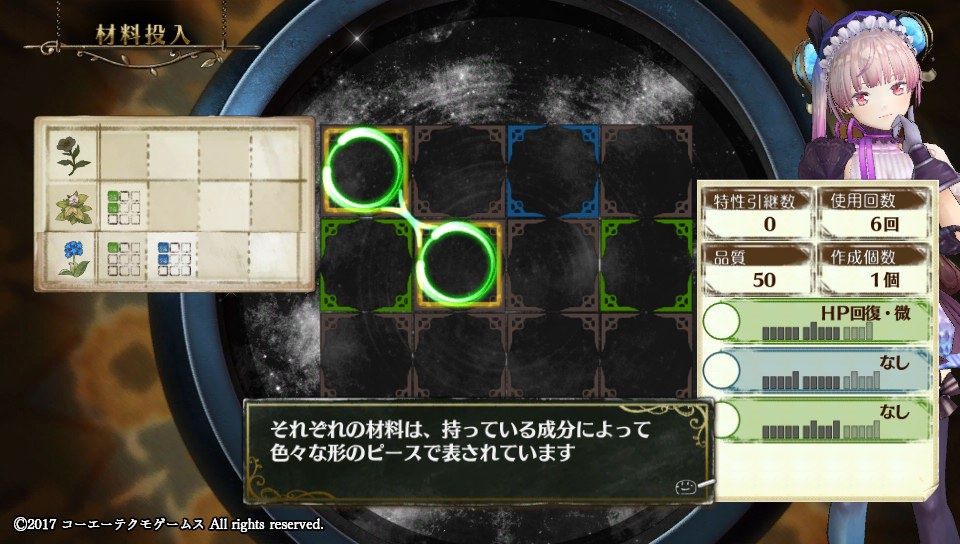 ここからの調合は、材料を入れるだけのこれまでとは違い、パズルのピースを埋めていくような調合に変わりました。