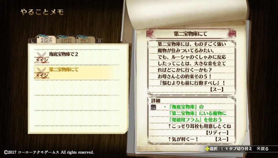 北へと進んで行く途中でイベント、壊れた宝箱の鍵を預かり、一度帰還して調合で直さなくてはなりません。