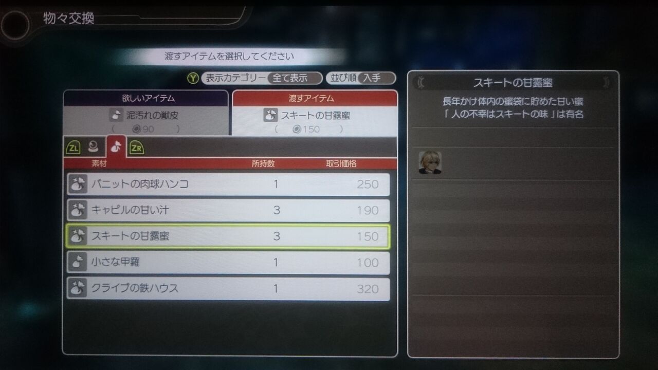 続いて選択したアイテムより価値の高い物を、自分の手持ちアイテムの中から選択する(ZRやZLボタンで渡すアイテムのカテゴリを変更できる)。