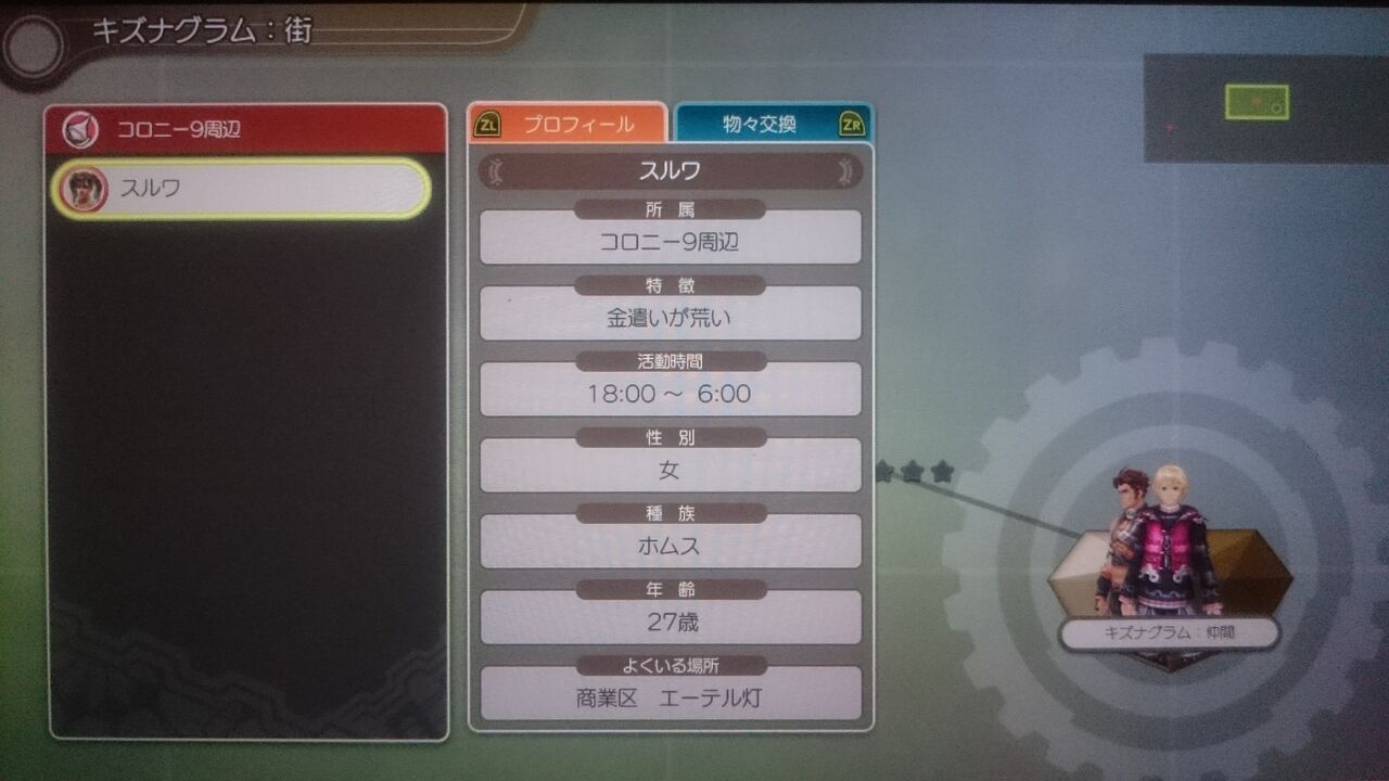 ここで物々交換でもらえる物を確認でき、その人にカーソルを合わせた状態でRボタンを押せばミニマップやエリアマップに虫眼鏡のようなアイコンが付く。