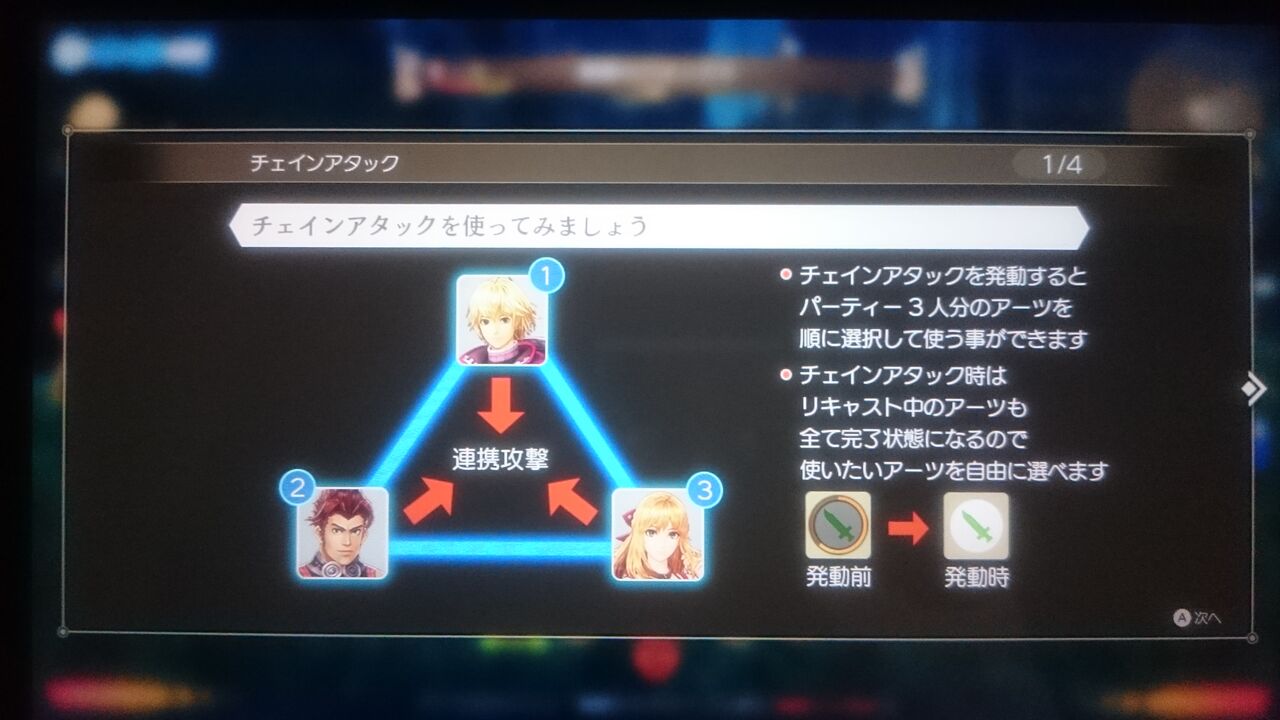チェインアタックを発動すると、バトルメンバー3人分のアーツを順番に選択して使うことができます。