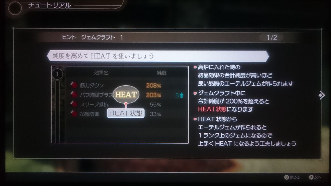 純度が高いほど良い品質のジェムが作られ、200%を超えてHEAT状態になったら1ランク上のジェムに変化する。