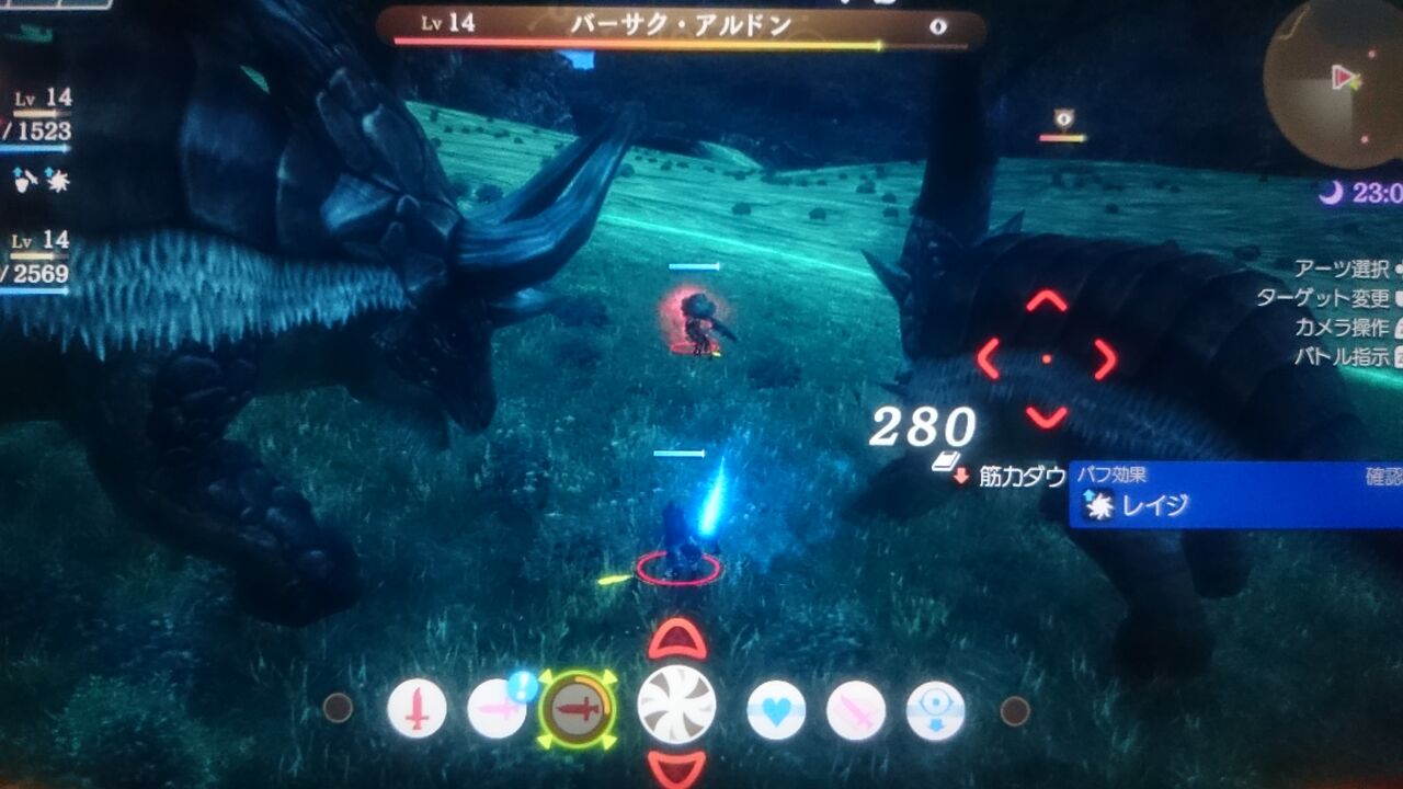 敵はレベル14のバーサーク・アルドン2体で、弱くはないですし「出血」の状態異常にもしてくるため、回復や補助アーツも適度に使用しましょう。