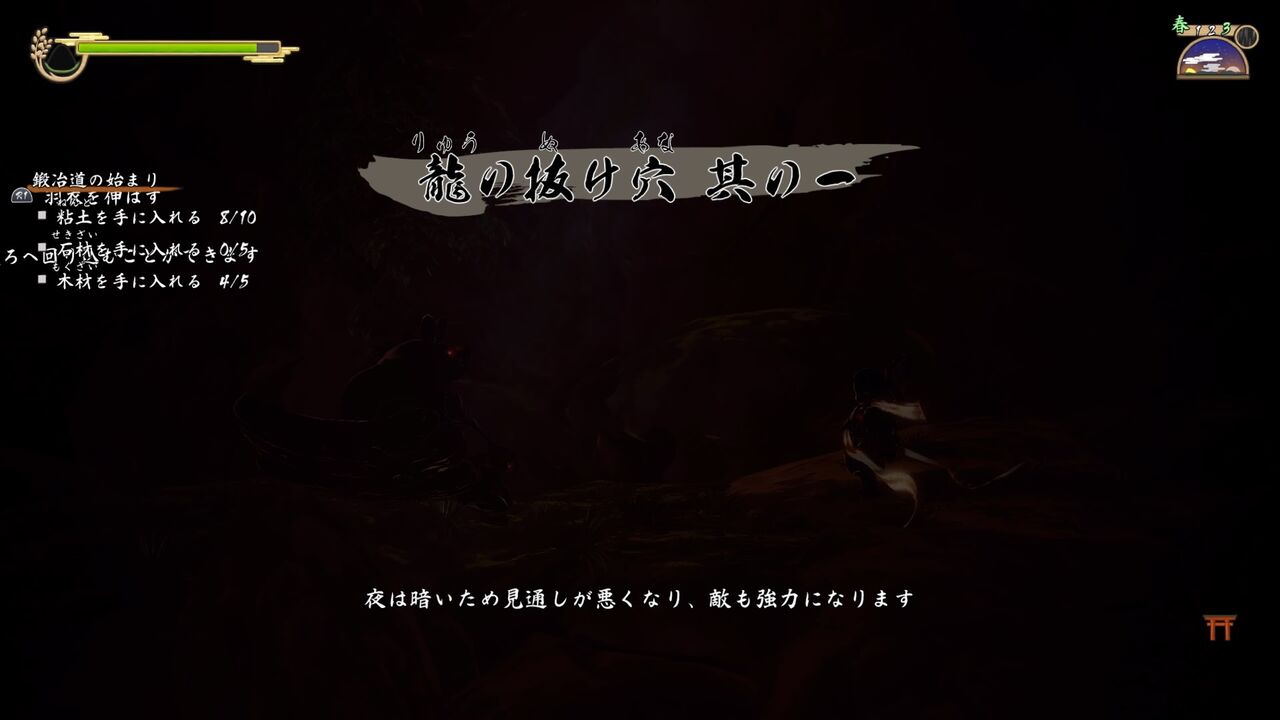 現状の攻撃力では一回の攻撃でのダメージは1しか入らず、撃破まで何時間かかるのかというほどだったので、夜になったら敵は完全無視して先を急ぎましょう。