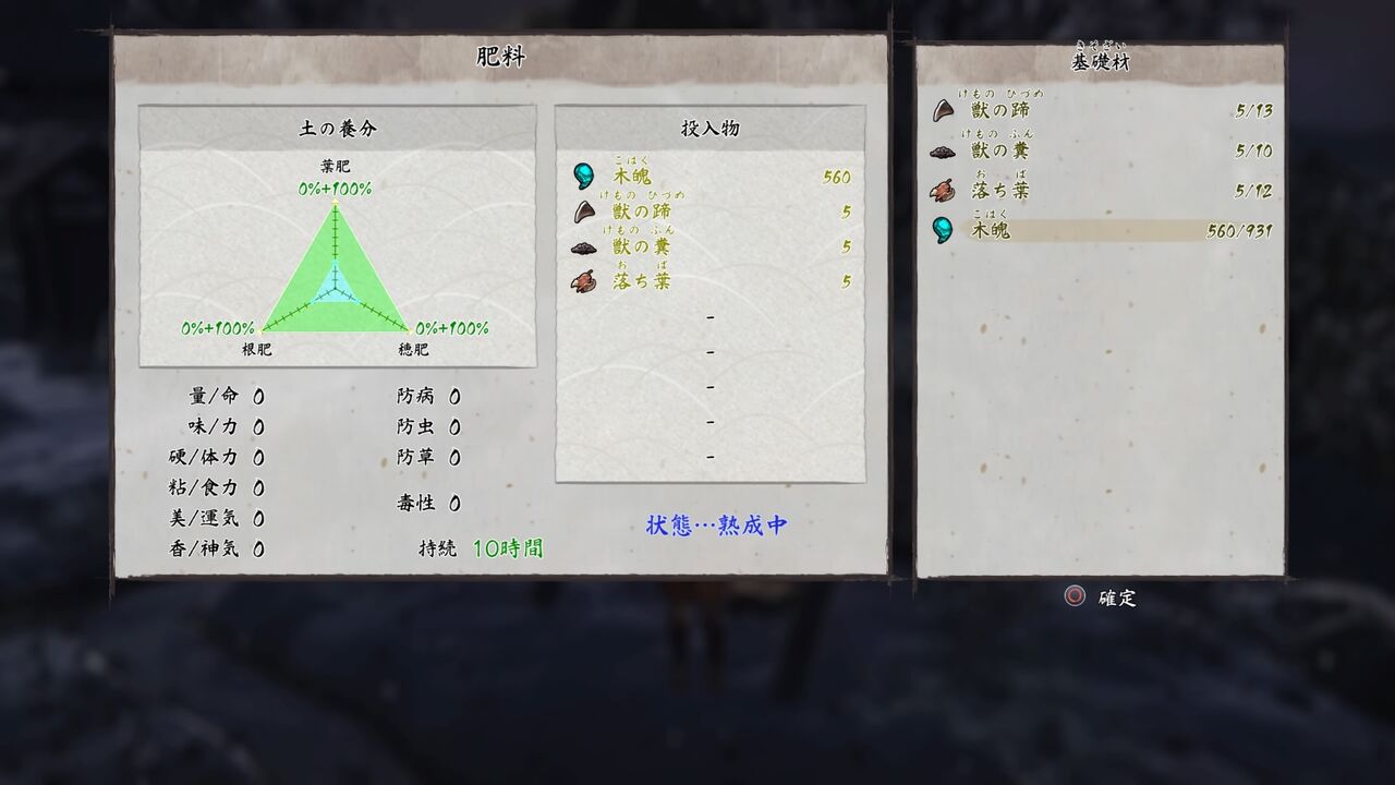 「木魄」以外は、葉肥、根肥、稲肥という項目を最大100%まで持って行くためのもののようで、各5個ずつも投入すればどれも100%になりました。