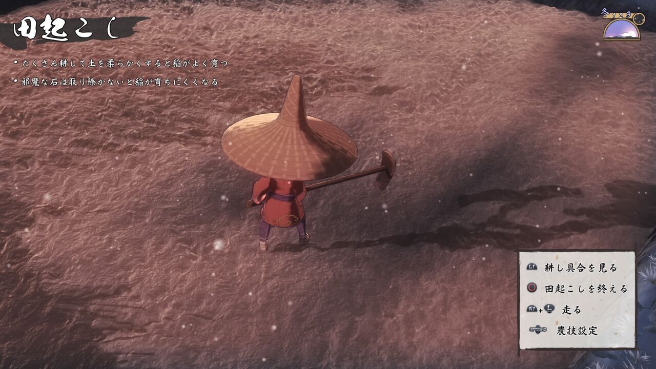 途中で農技「地力視」を習得したら、L1ボタンで土の状態が見られます。
