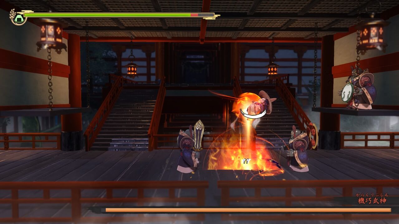 3体とも残っている間は、左右の端には地面よりちょっと上に足場があるのでその上に乗ったり、天井に羽衣で張り付くなどといった行動も、敵の攻撃を避けるのに役立ちました。